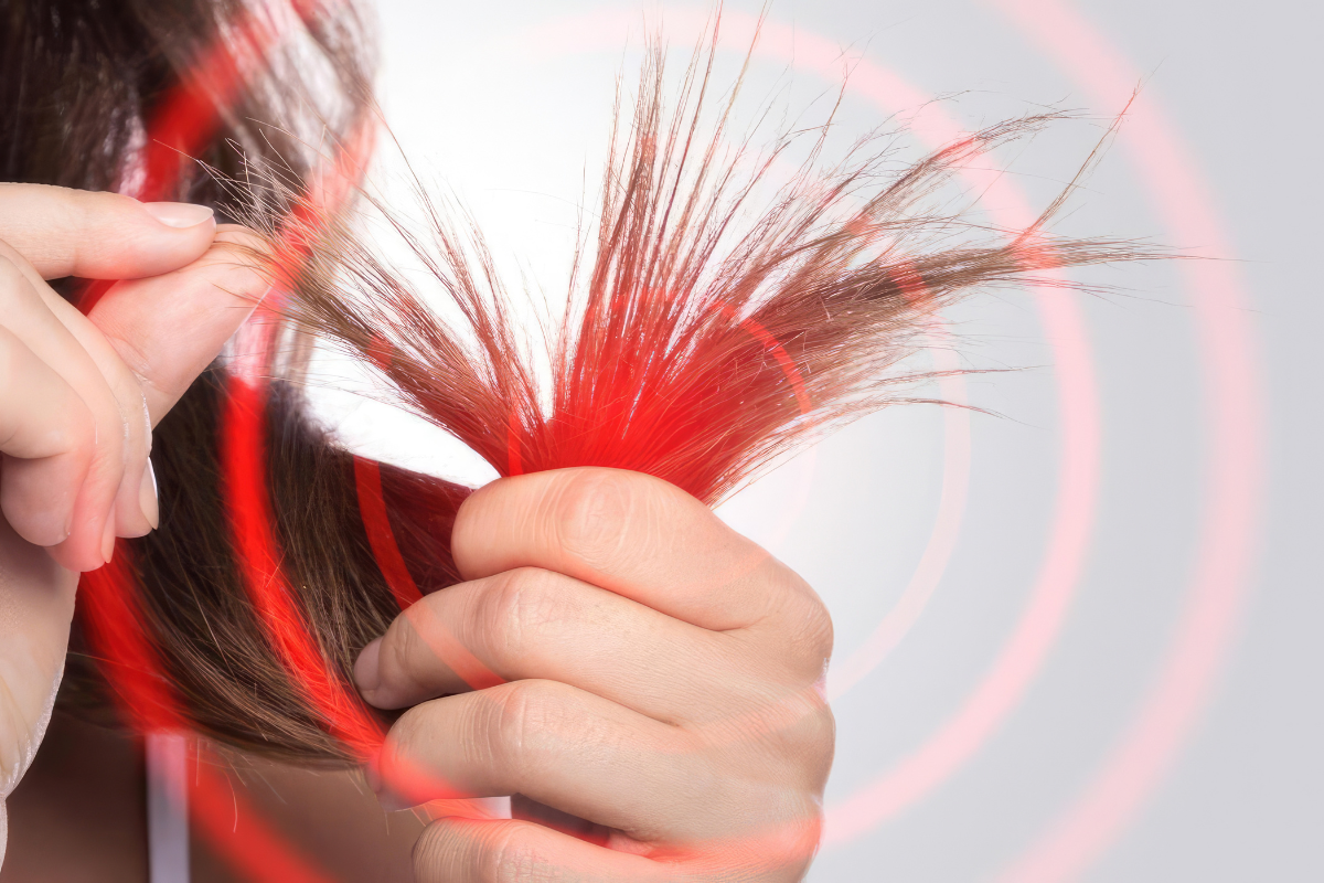 Split ends occur when the hair shaft becomes damaged and frays at the tips due to dryness, heat styling, and lack of proper nourishment.